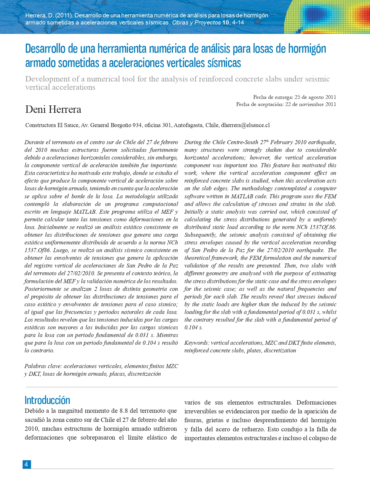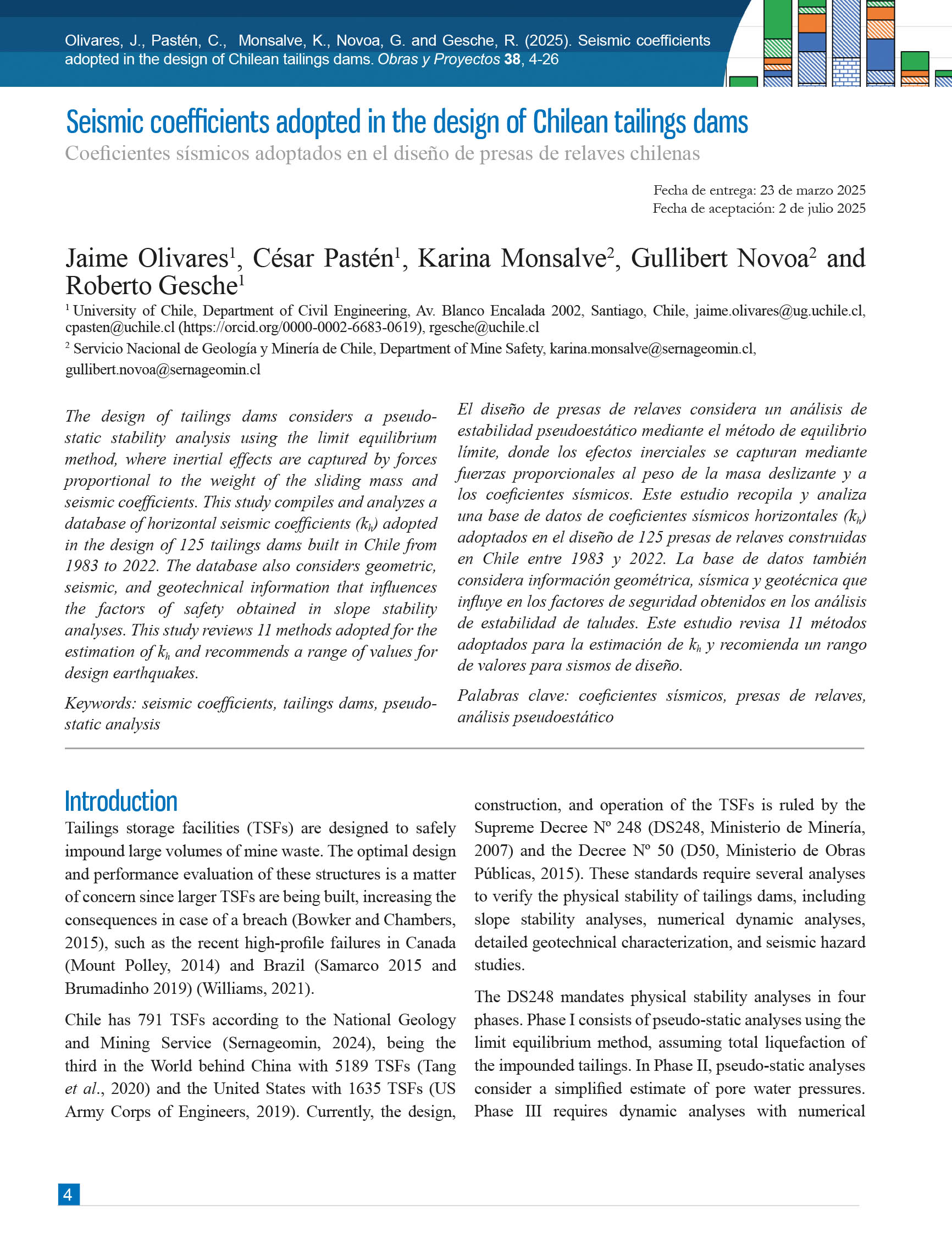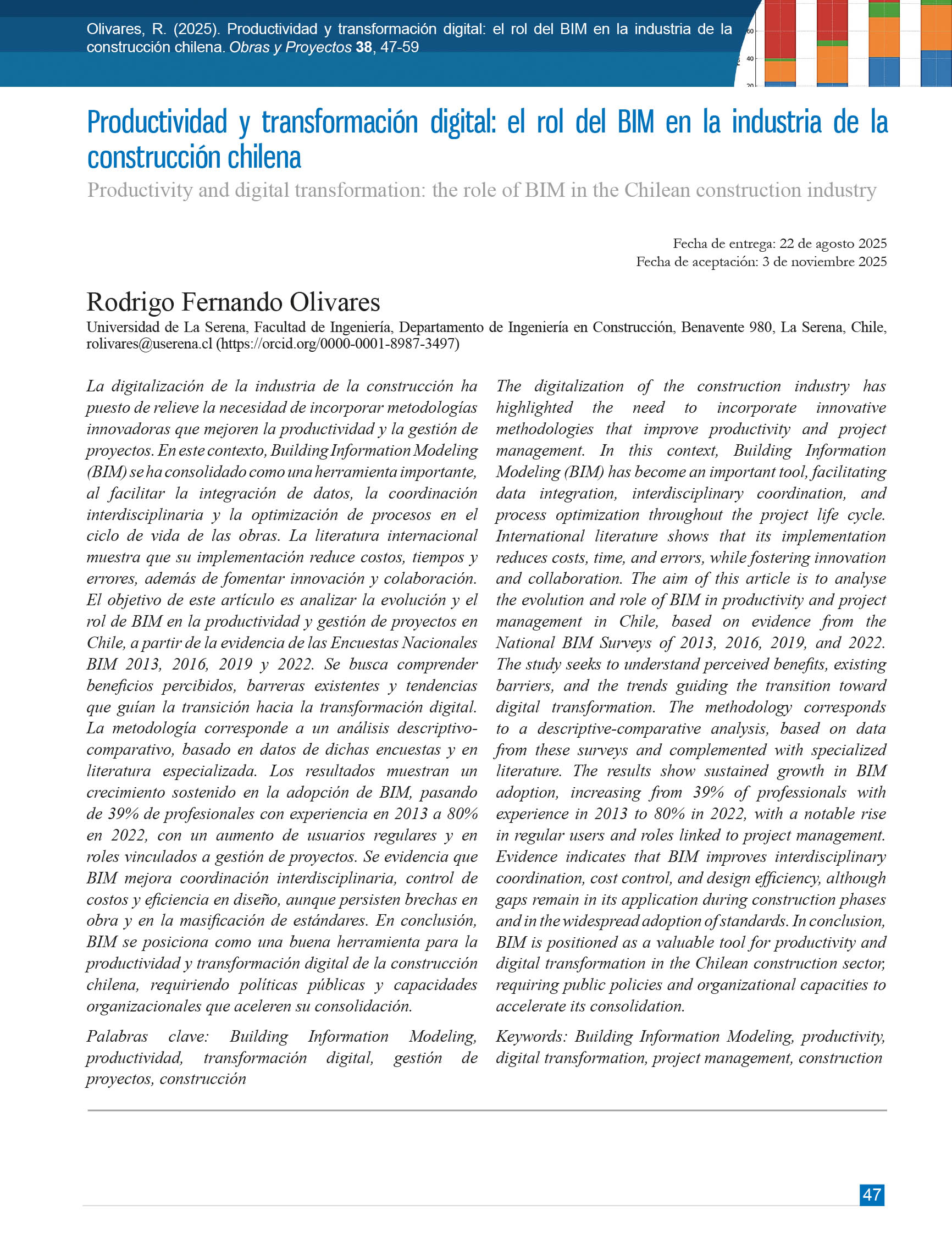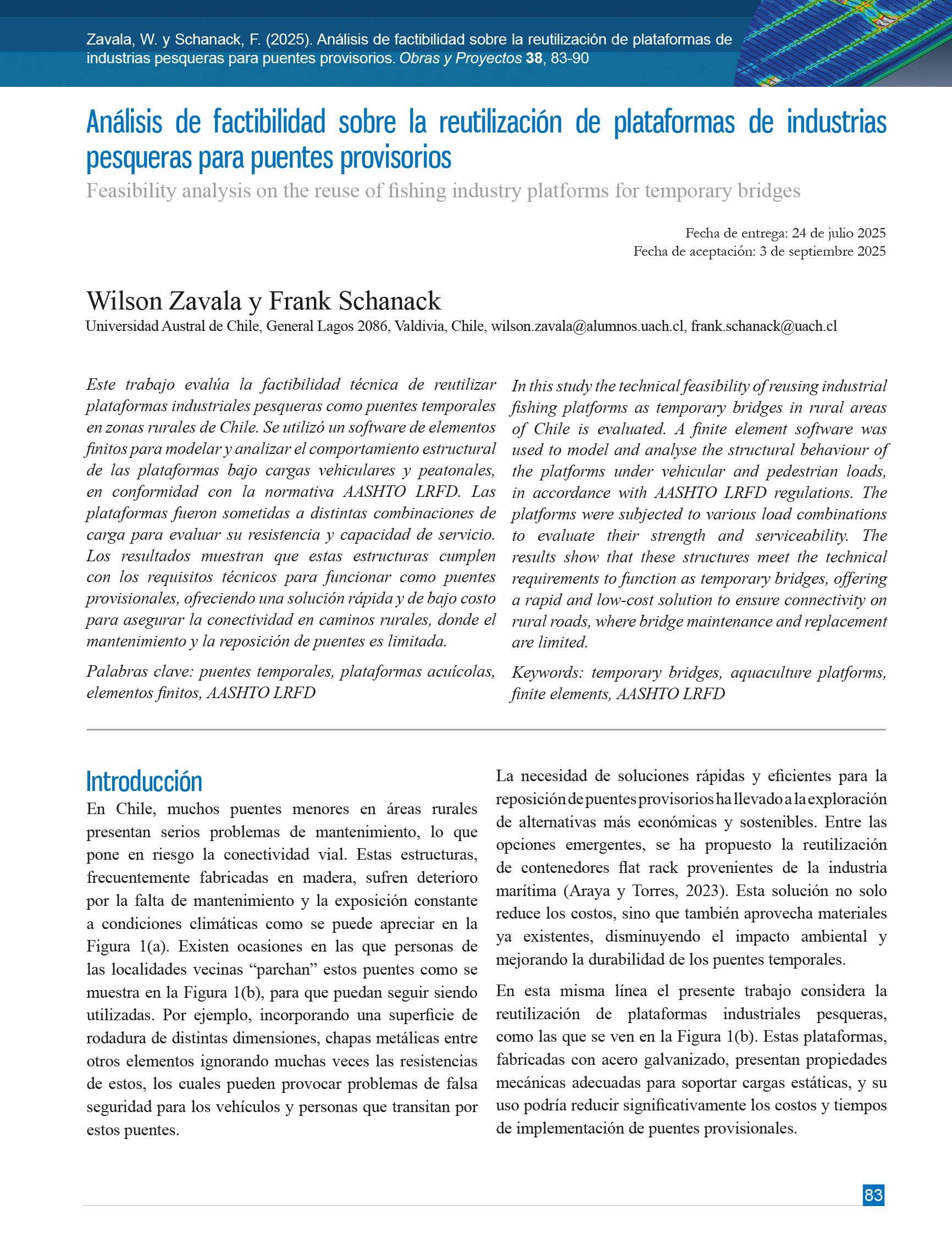 Obras y Proyectos es una publicación cuya misión es difundir, promover y fomentar la investigación, contribuyendo al intercambio de conocimientos entre los profesionales de la comunidad de la Ingeniería Civil. Para ello se consideran trabajos originales y científicos, así como notas técnicas orientadas principalmente a mostrar y discutir trabajos y proyectos relevantes. También se presentan trabajos técnicos que muestran innovaciones y aplicaciones utilizadas principalmente por empresas y consultoras involucradas en Ingeniería Civil. De esta forma se desarrollan las ramas clásicas de la Ingeniería Civil, a saber, Estructuras, Hidráulica, Geotecnia, Transporte y Construcción. Además, se consideran otras áreas relacionadas y aplicadas a la Ingeniería Civil como Energía, Medio Ambiente, Geología, Minería, Informática y Tecnología.De esta forma Obras y Proyectos busca la participación de un grupo amplio que abarca desde el mundo universitario, organismos públicos y el mundo empresarial.