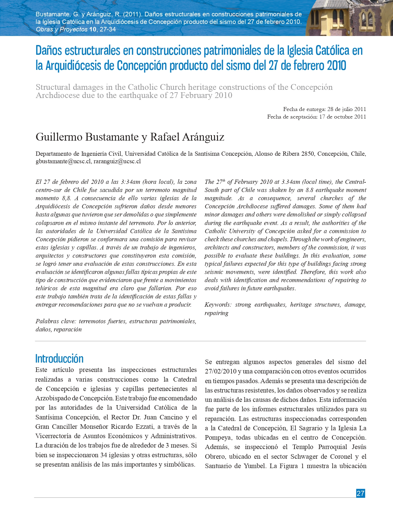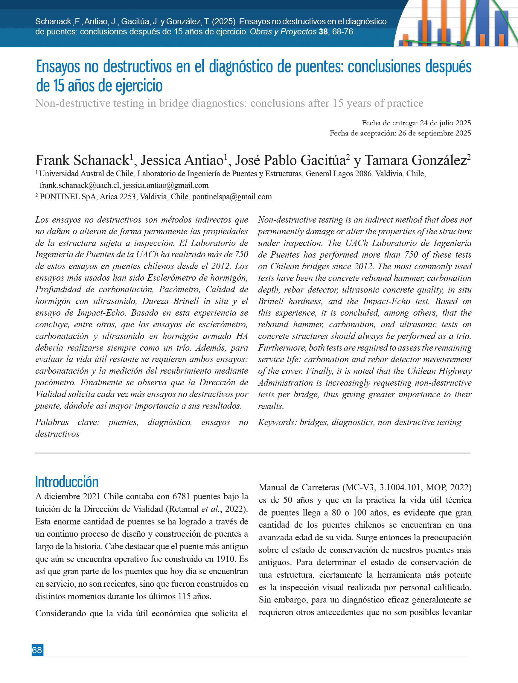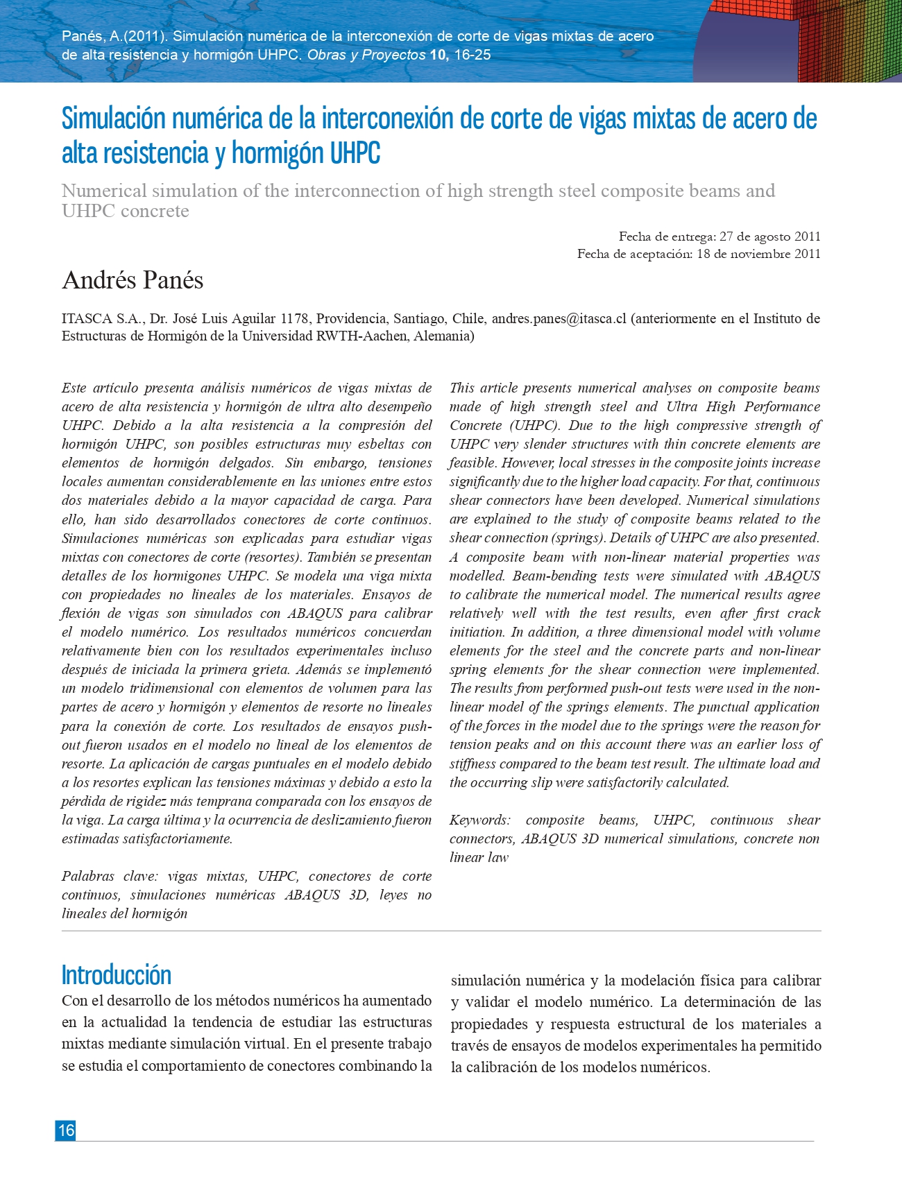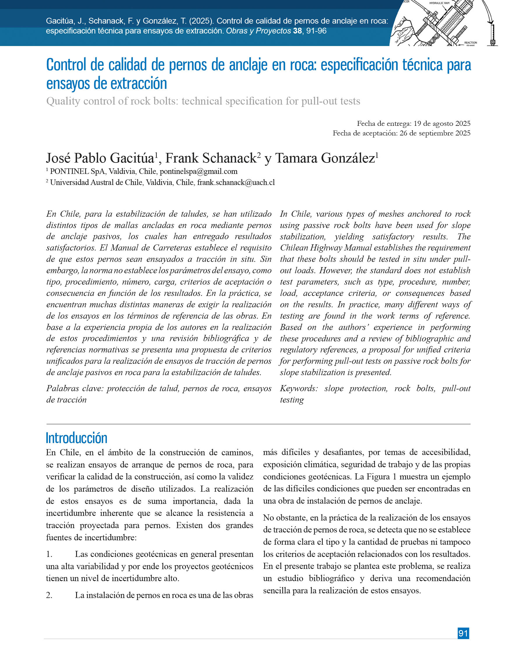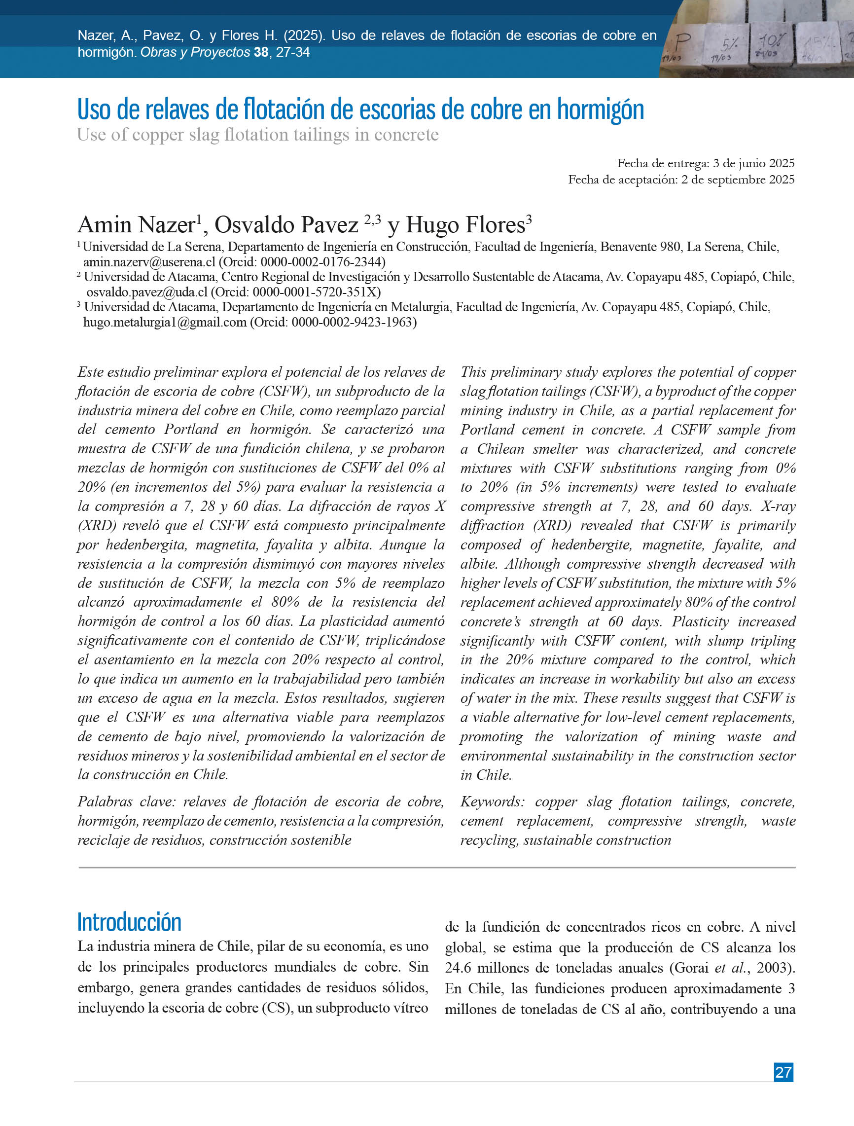 Obras y Proyectos es una publicación cuya misión es difundir, promover y fomentar la investigación, contribuyendo al intercambio de conocimientos entre los profesionales de la comunidad de la Ingeniería Civil. Para ello se consideran trabajos originales y científicos, así como notas técnicas orientadas principalmente a mostrar y discutir trabajos y proyectos relevantes. También se presentan trabajos técnicos que muestran innovaciones y aplicaciones utilizadas principalmente por empresas y consultoras involucradas en Ingeniería Civil. De esta forma se desarrollan las ramas clásicas de la Ingeniería Civil, a saber, Estructuras, Hidráulica, Geotecnia, Transporte y Construcción. Además, se consideran otras áreas relacionadas y aplicadas a la Ingeniería Civil como Energía, Medio Ambiente, Geología, Minería, Informática y Tecnología.De esta forma Obras y Proyectos busca la participación de un grupo amplio que abarca desde el mundo universitario, organismos públicos y el mundo empresarial.