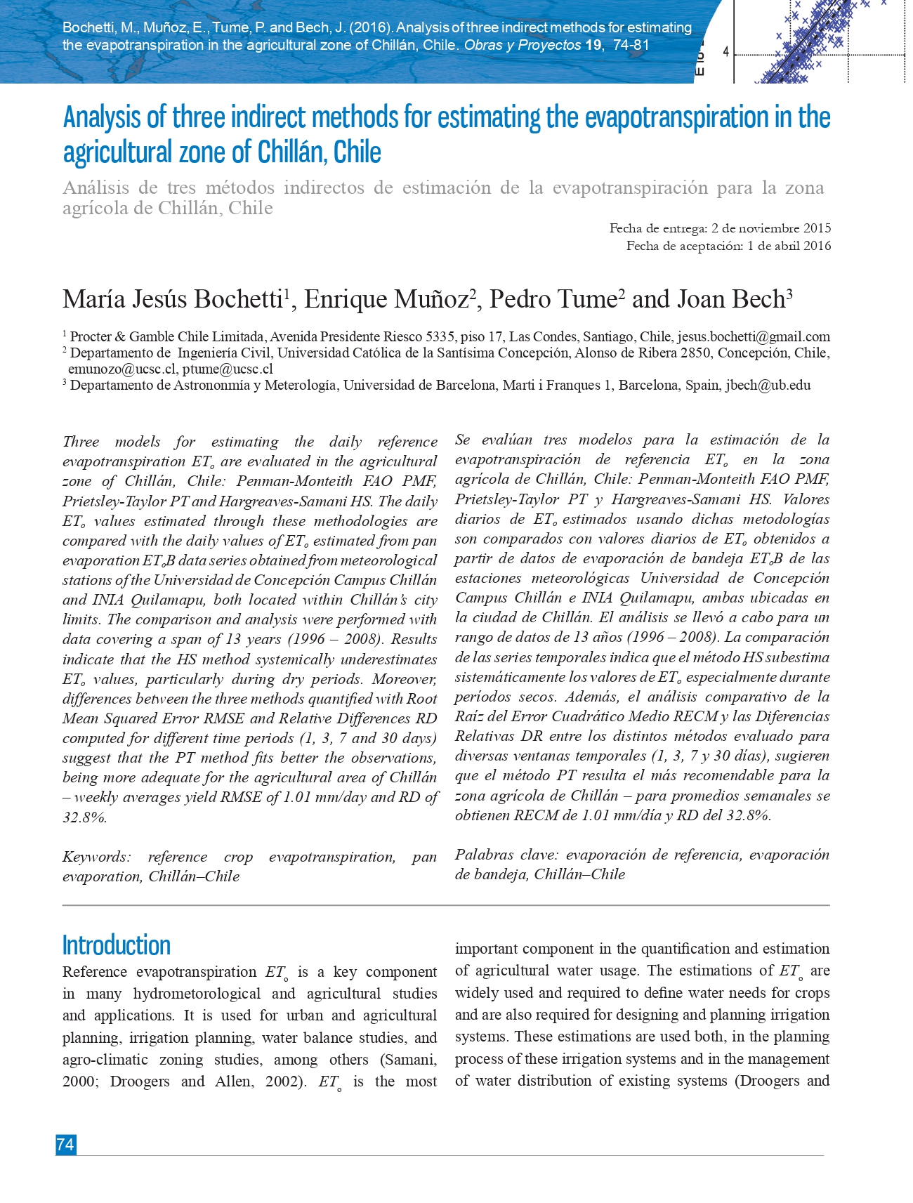 Análisis de tres métodos indirectos de estimación de la evapotranspiración para la zona agrícola de Chillán, Chile