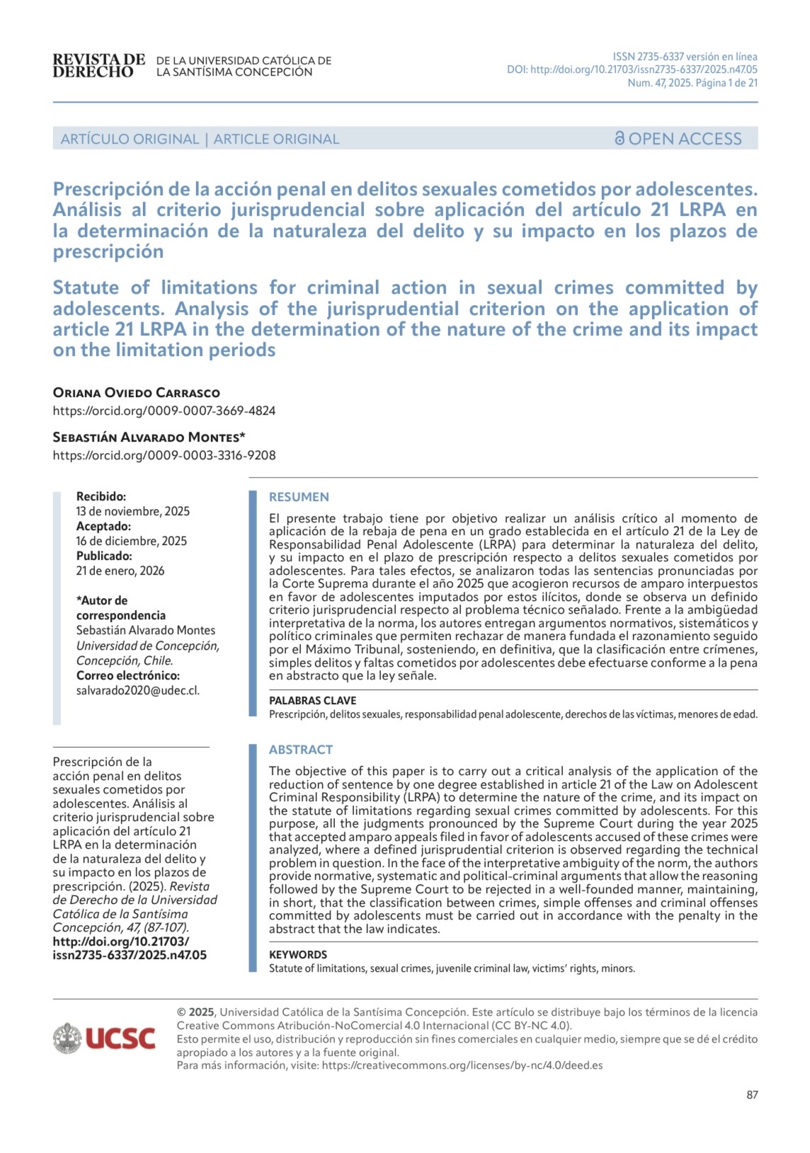 Prescripción de la acción penal en delitos sexuales cometidos por adolescentes. Análisis al criterio jurisprudencial sobre aplicación del artículo 21 LRPA en la determinación de la naturaleza del delito y su impacto en los plazos de prescripción. (2026). Revista De Derecho De La Universidad Católica De La Santísima Concepción, 47, 87-107. https://doi.org/10.21703/issn2735-6337/2025.n47.05